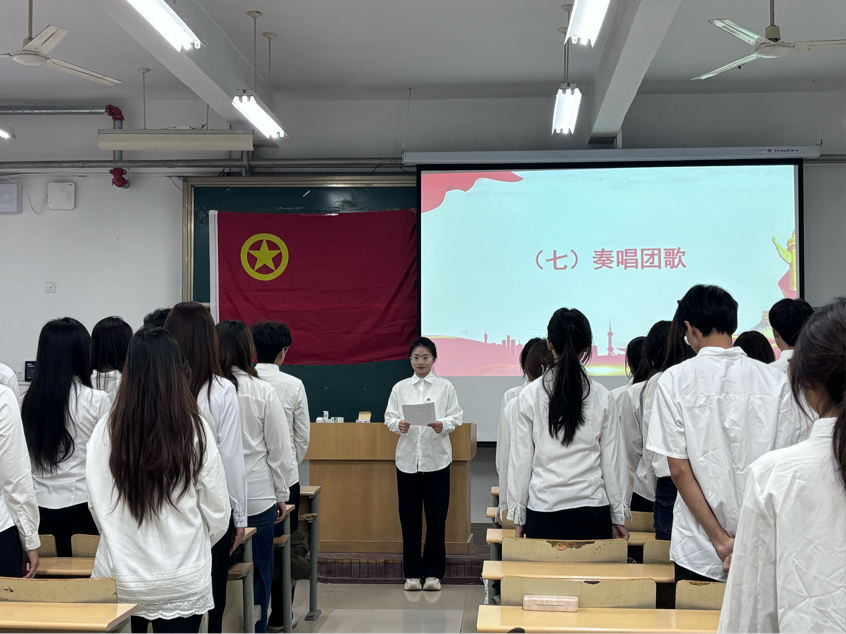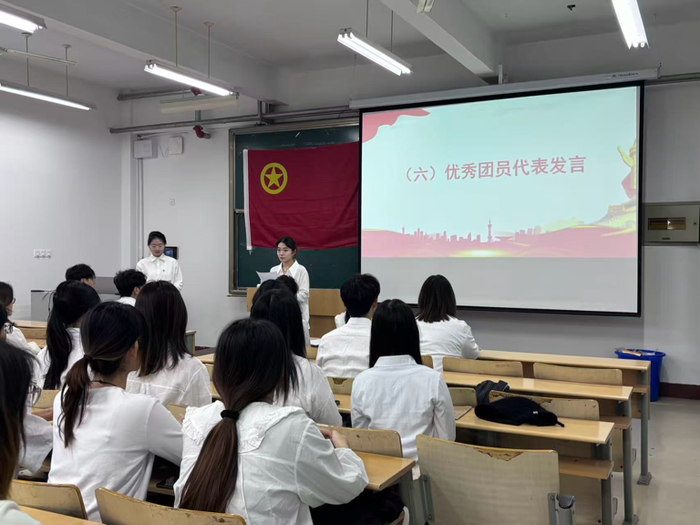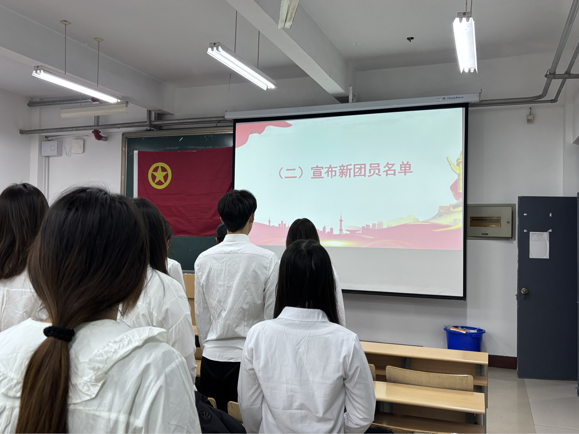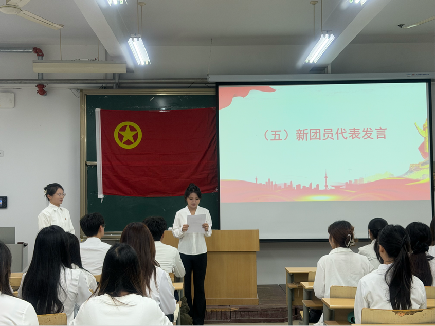 接下来是神圣的宣誓礼环节,新团员们举起右拳,面向团旗庄严宣誓,铿锵有力的誓言回荡在会议室的每一个角落,表达了他们对共青团组织的无限忠诚与为共产主义事业奋斗的坚定决心。宣誓完毕后,新团员代表上台发言,分享了加入共青团的激动心情,并承诺将以团员的标准严格要求自己,在学习和生活中发挥先锋模范作用。随后,优秀团员代表高莉鑫结合自身经历,向新团员们分享了成长感悟与奋斗心得,鼓励大家珍惜团员身份,勇于担当,追求卓越。