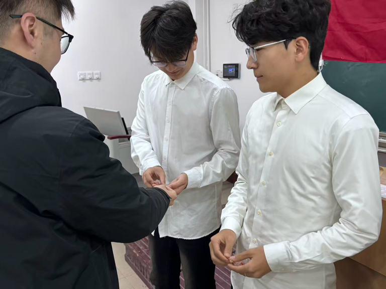 仪式在庄严的国歌声中拉开序幕,全体人员肃立致敬,爱国情怀在激昂的旋律中悄然涌动。随后,主持人庄重宣布新发展团员名单,新团员们身着整洁服装,脸上洋溢着自豪与期待。在热烈的掌声中,段兆岢老师为新团员颁发团章,小小的团章承载着责任与使命,成为新团员们开启团员生涯的珍贵纪念。